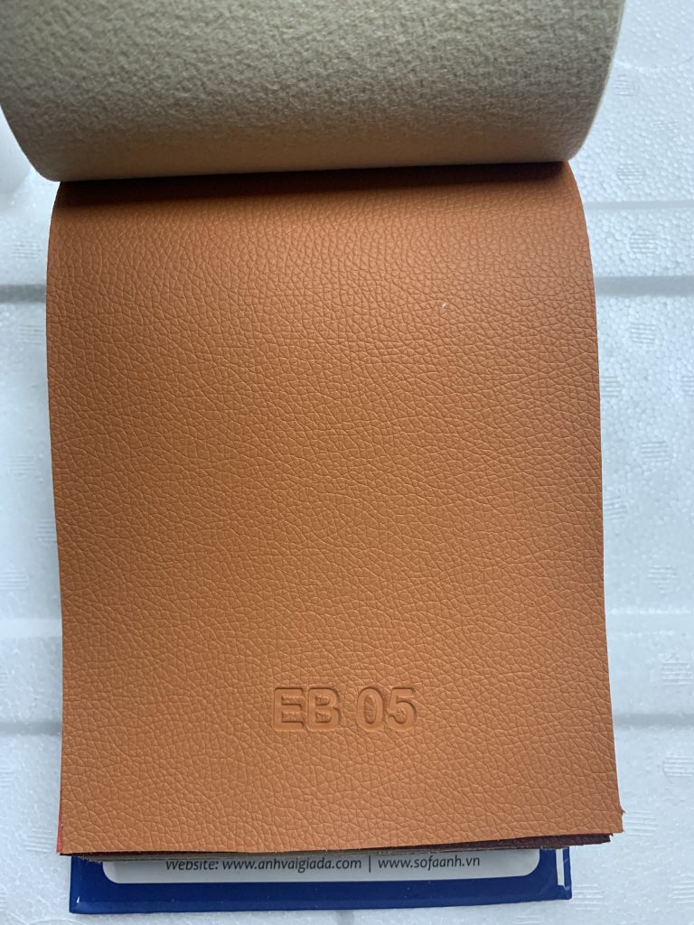 Mẫu vải giả da có mã EB05 là một sản phẩm da cao cấp, nằm trong bộ sưu tập vải giả da cao cấp EB, gồm 45màu. Sản phẩm có độ dầy 1 ly, khổ da 1.4m, vân da cao cấp, lót chắc chắn bền đẹp. Sản phẩm thích hợp làm những sản phẩm liên quan đến ghế da như ghế sofa, ghế da ô tô,… Bộ da EB rất được khách hàng ưa chuộng để tạo nên những sản phẩm chất lượng.