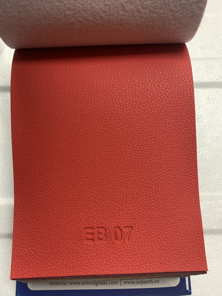 Mẫu vải giả da có mã EB07 là một sản phẩm da cao cấp, nằm trong bộ sưu tập vải giả da cao cấp EB, gồm 45màu. Sản phẩm có độ dầy 1 ly, khổ da 1.4m, vân da cao cấp, lót chắc chắn bền đẹp. Sản phẩm thích hợp làm những sản phẩm liên quan đến ghế da như ghế sofa, ghế da ô tô,… Bộ da EB rất được khách hàng ưa chuộng để tạo nên những sản phẩm chất lượng.