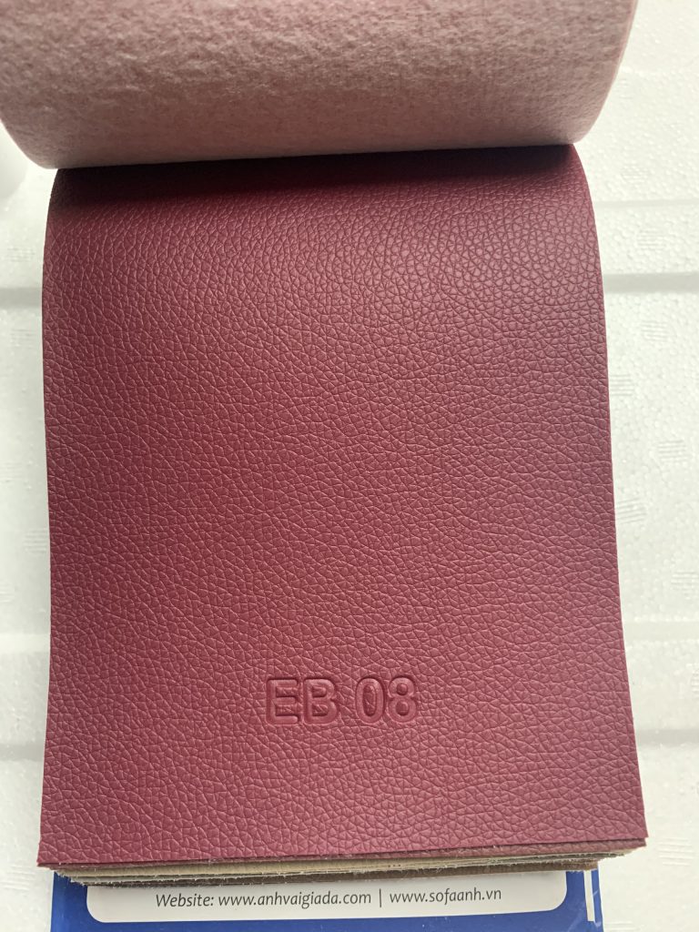 Mẫu vải giả da có mã EB08 là một sản phẩm da cao cấp, nằm trong bộ sưu tập vải giả da cao cấp EB, gồm 45màu. Sản phẩm có độ dầy 1 ly, khổ da 1.4m, vân da cao cấp, lót chắc chắn bền đẹp. Sản phẩm thích hợp làm những sản phẩm liên quan đến ghế da như ghế sofa, ghế da ô tô,… Bộ da EB rất được khách hàng ưa chuộng để tạo nên những sản phẩm chất lượng.