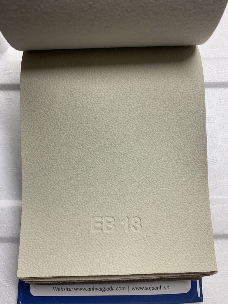 Mẫu vải giả da có mã EB13 là một sản phẩm da cao cấp, nằm trong bộ sưu tập vải giả da cao cấp EB, gồm 45màu. Sản phẩm có độ dầy 1 ly, khổ da 1.4m, vân da cao cấp, lót chắc chắn bền đẹp. Sản phẩm thích hợp làm những sản phẩm liên quan đến ghế da như ghế sofa, ghế da ô tô,… Bộ da EB rất được khách hàng ưa chuộng để tạo nên những sản phẩm chất lượng.