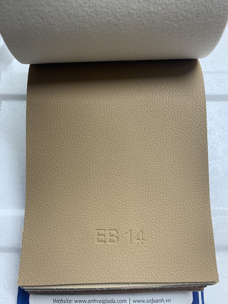 Mẫu vải giả da có mã EB14 là một sản phẩm da cao cấp, nằm trong bộ sưu tập vải giả da cao cấp EB, gồm 45màu. Sản phẩm có độ dầy 1 ly, khổ da 1.4m, vân da cao cấp, lót chắc chắn bền đẹp. Sản phẩm thích hợp làm những sản phẩm liên quan đến ghế da như ghế sofa, ghế da ô tô,… Bộ da EB rất được khách hàng ưa chuộng để tạo nên những sản phẩm chất lượng.