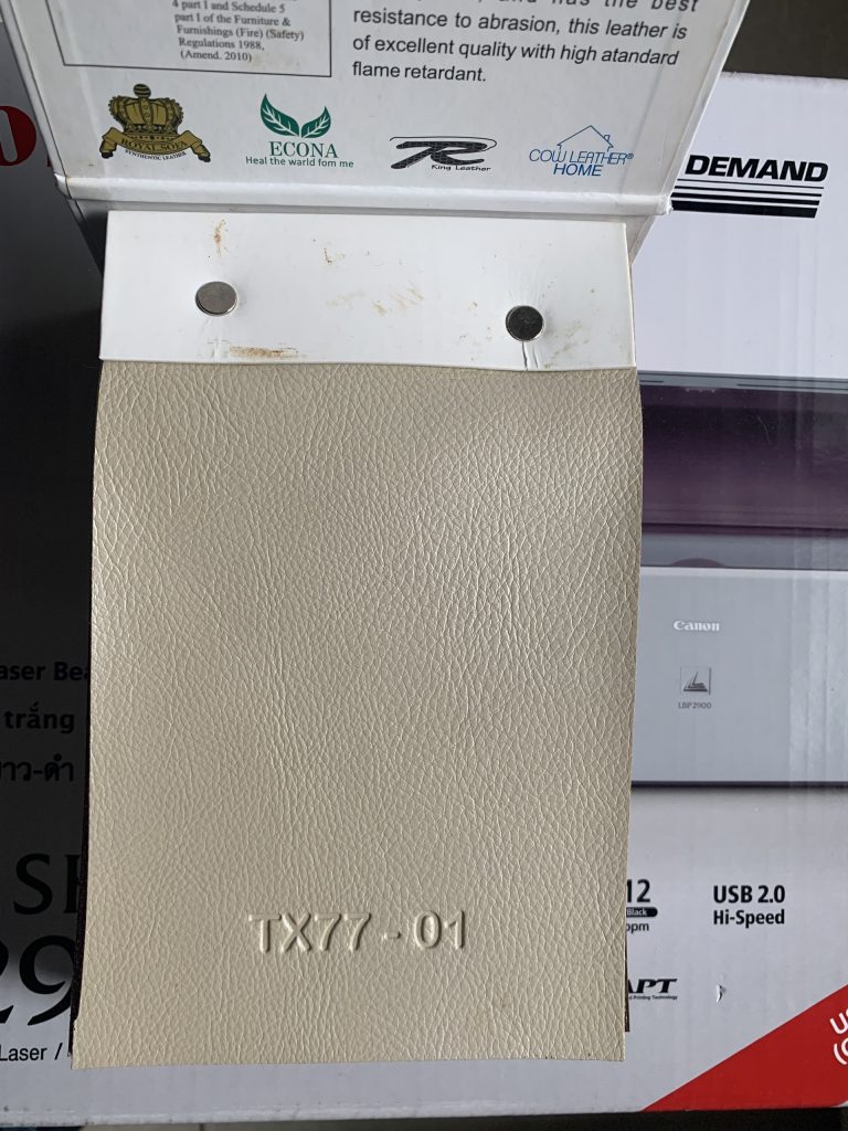 Mẫu vải giả da có mã TX77-01 là một sản phẩm da cao cấp, nằm trong bộ sưu tập vải giả da cao cấp TX77, gồm 21 màu. Sản phẩm có độ dầy 1 ly, khổ da 1.4m, vân da cao cấp, lót chắc chắn bền đẹp. Sản phẩm thích hợp làm những sản phẩm liên quan đến ghế da như ghế sofa, ghế da ô tô,… Bộ da TX77 rất được khách hàng ưa chuộng để tạo nên những sản phẩm chất lượng.