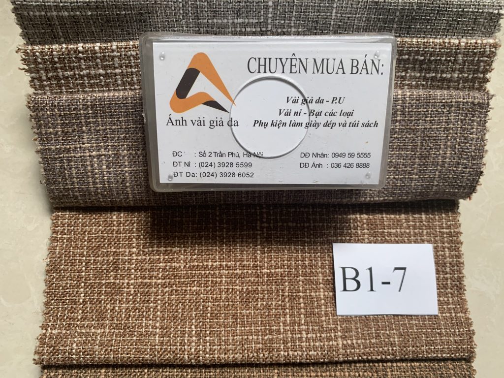 Vải nỉ B1-7 thuộc bộ sưu tập mẫu vải nỉ B1 gồm 37 màu. Đây là sản phẩm có màu sáng, thân thiện và khá đẹp mắt, được ứng dụng nhiều trong các sản phẩm nội thất như ghế sofa…